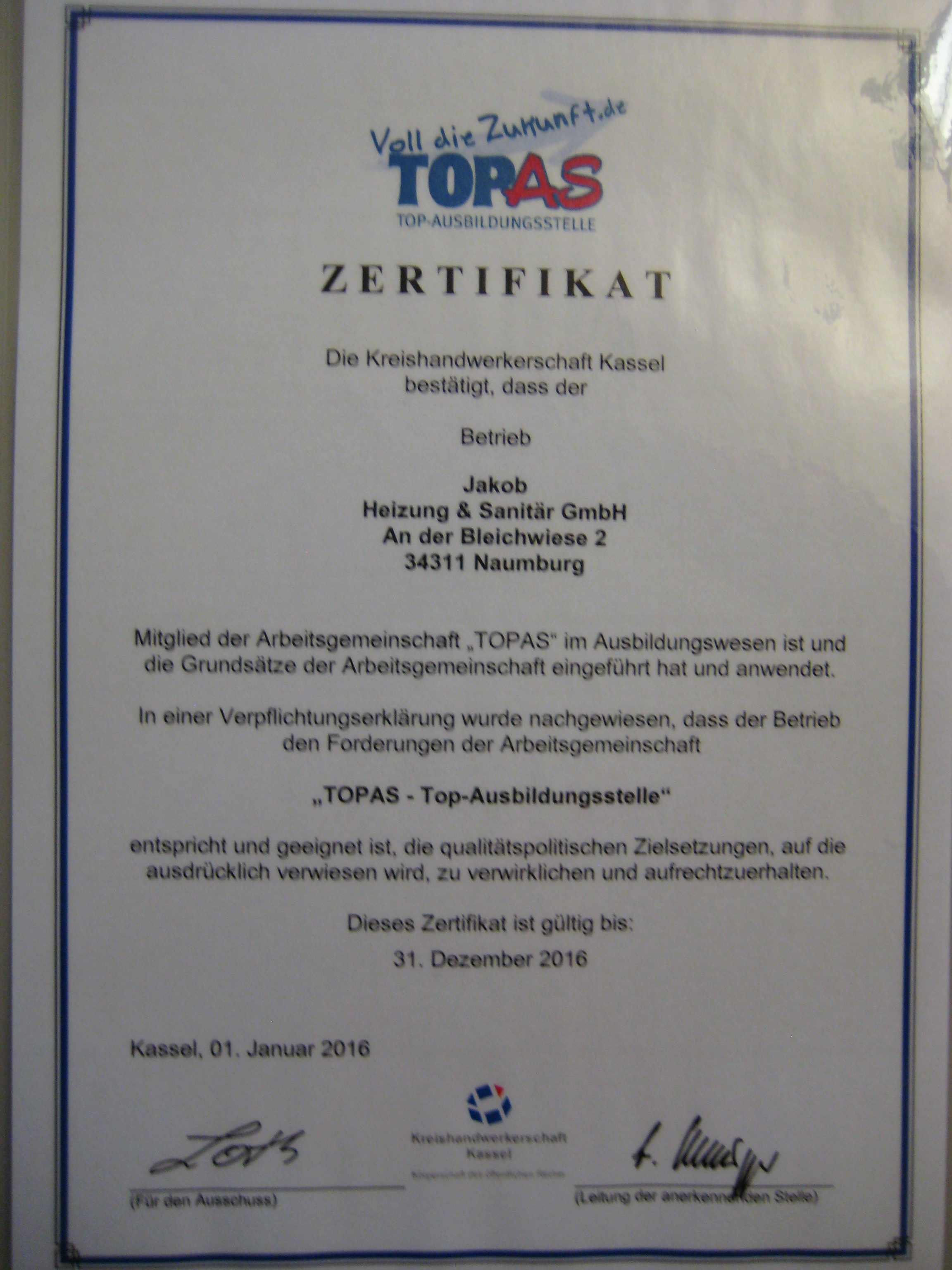 Auch für 2016 sind wir wieder mit dem Zertifikat „Top-Ausbildungsstelle“